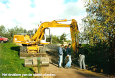 Onderhoud damwandDe destijds van bielsen en planken gemaakte beschoeiïng ter hoogte van de duiker in de dam was aan vervanging toe. Met wat op de kop getikte stalen damwandplanken is de houten beschoeiïng vervangen. Naderhand is de bovenkant met een betonnen balk en een passende afscheiding afgewerkt. Het geheel kan nu weer jaren mee. |